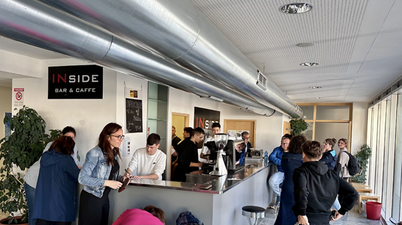 Schülerinnen und Schülern komplett selbstständig betriebene Café im Eingangsbereich/Aula